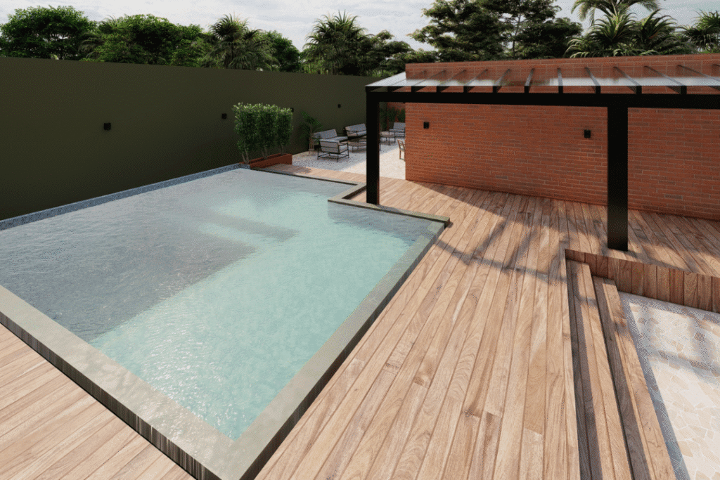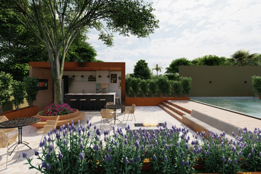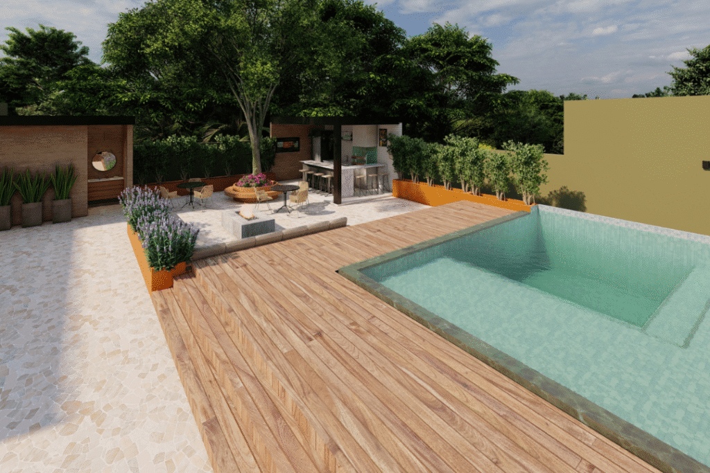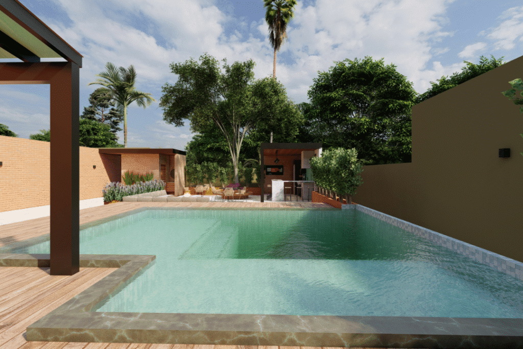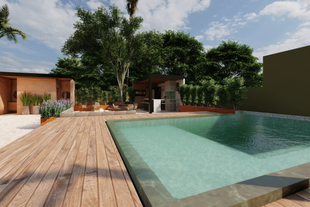 Antes de tudo, entendemos que uma área gourmet bem planejada precisa incentivar o convívio. Por esse motivo, o layout prioriza a integração entre os ambientes externos, criando uma circulação fluida e intuitiva. Além disso, a conexão visual entre a área gourmet, a piscina e a área de descanso amplia a sensação de espaço e reforça o conceito de refúgio residencial.