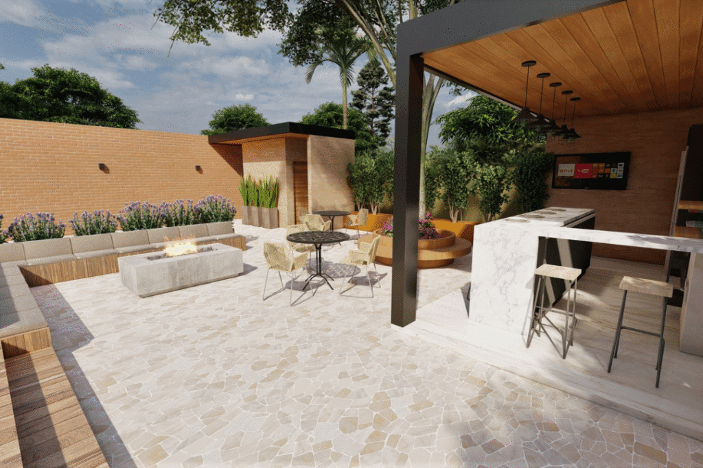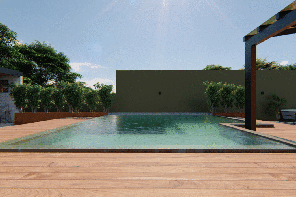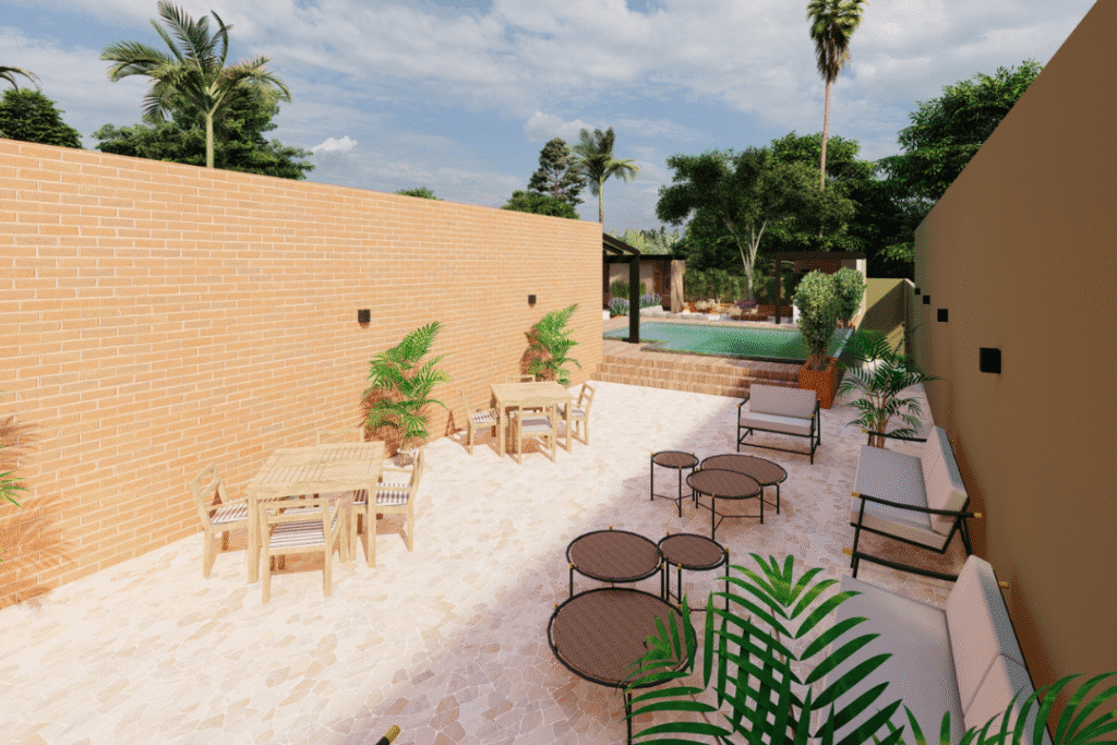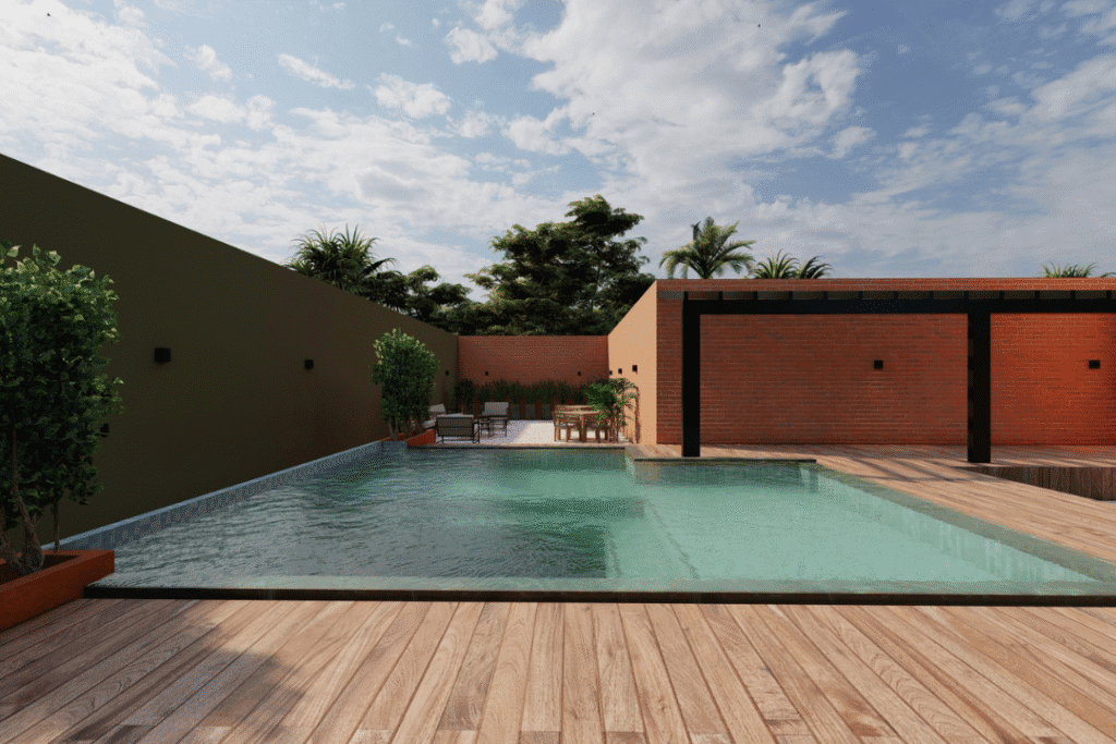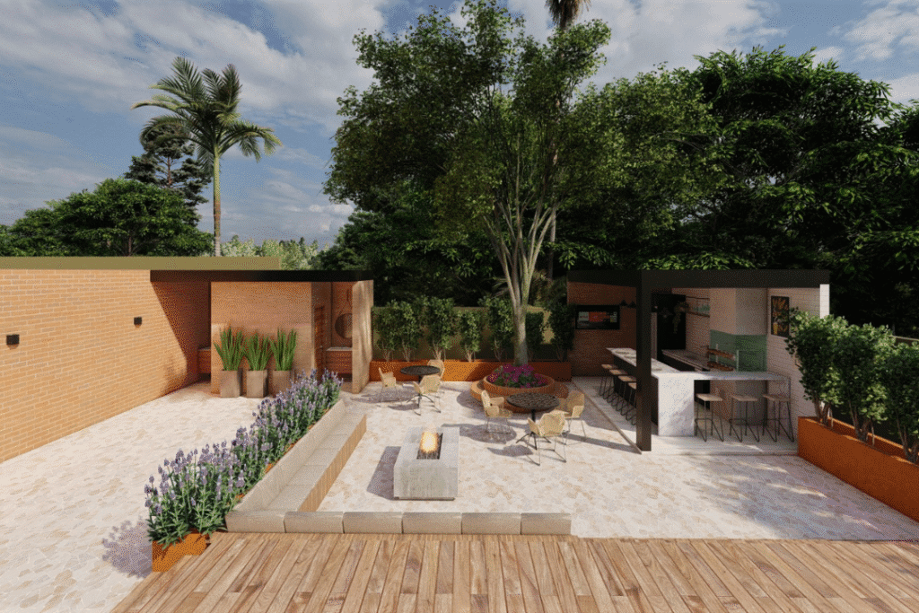 Antes de tudo, entendemos que uma área gourmet bem planejada precisa incentivar o convívio. Por esse motivo, o layout prioriza a integração entre os ambientes externos, criando uma circulação fluida e intuitiva. Além disso, a conexão visual entre a área gourmet, a piscina e a área de descanso amplia a sensação de espaço e reforça o conceito de refúgio residencial.