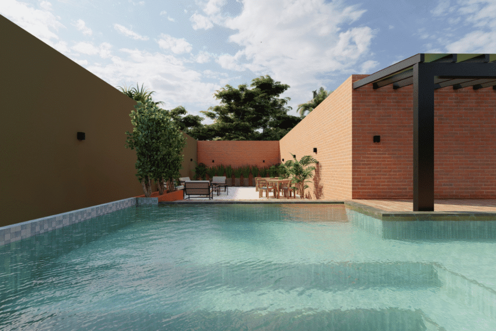 Além de refrescar os dias quentes, a piscina contribui diretamente para a estética do projeto. Durante o dia, ela traz leveza e sensação de frescor. À noite, por outro lado, a iluminação planejada transforma completamente o ambiente, criando uma atmosfera acolhedora e sofisticada. Assim, o espaço se adapta facilmente a diferentes usos e horários.