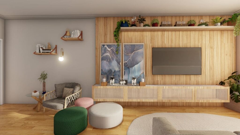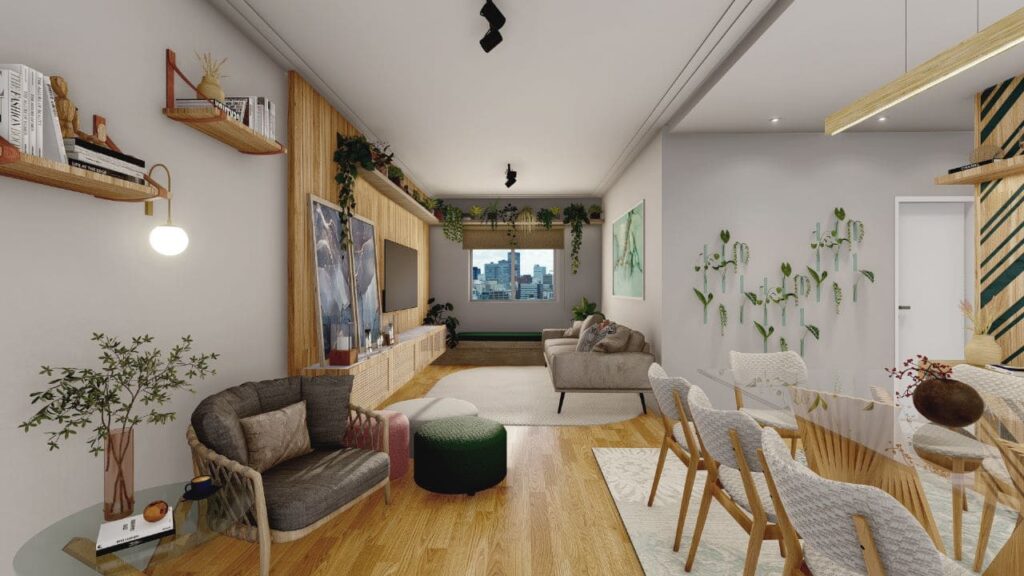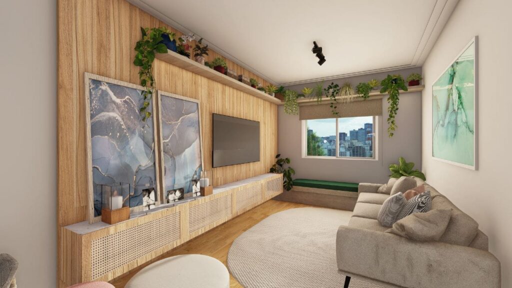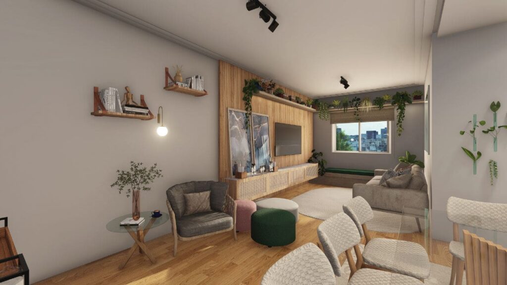 Além disso, os acabamentos modernos se misturam a materiais que proporcionam sensação de acolhimento. Assim, o projeto transmite praticidade e elegância ao mesmo tempo. A escolha da paleta de cores e a disposição de cada elemento decorativo reforçam a identidade das moradoras e tornam o lar sofisticado sem perder aconchego.