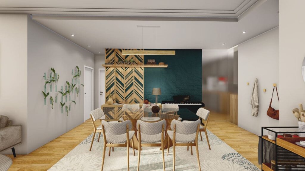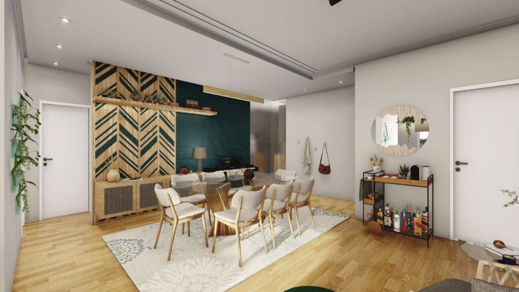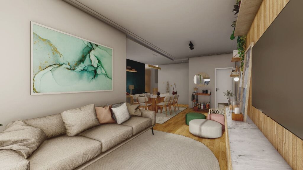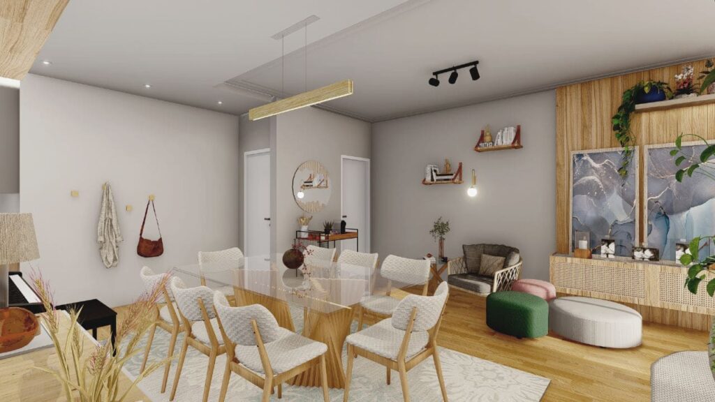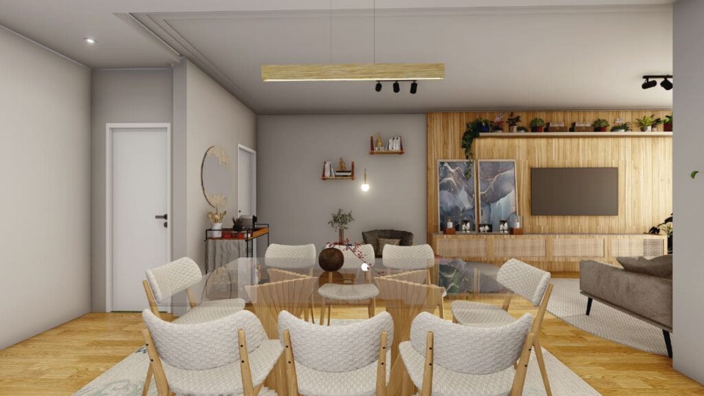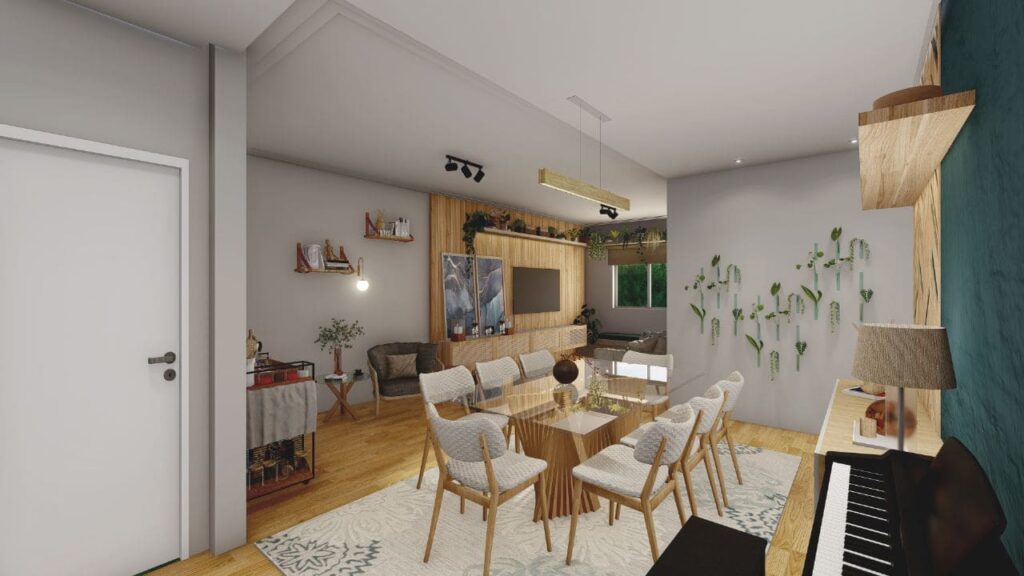Um dos pontos centrais do projeto foi integrar os ambientes, promovendo amplitude e fluidez. A sala de estar, a cozinha e a área de convivência se conectam de forma natural. Assim, os espaços se complementam e oferecem circulação confortável, ideal tanto para o convívio diário quanto para tarefas do dia a dia.