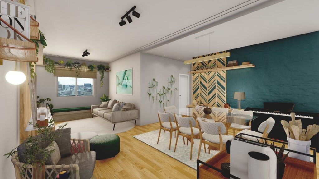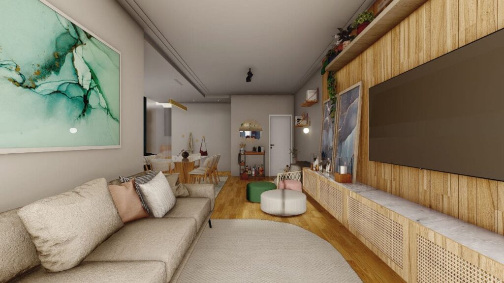 No entanto, a integração não eliminou a identidade de cada ambiente. Pelo contrário, cada espaço mantém seu caráter e dialoga harmoniosamente com os demais. Dessa forma, o apartamento atende às necessidades práticas da mãe e da filha, sem perder o charme e o conforto que tornam cada canto especial.