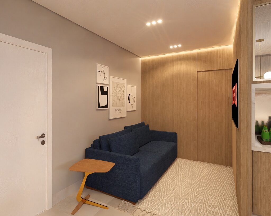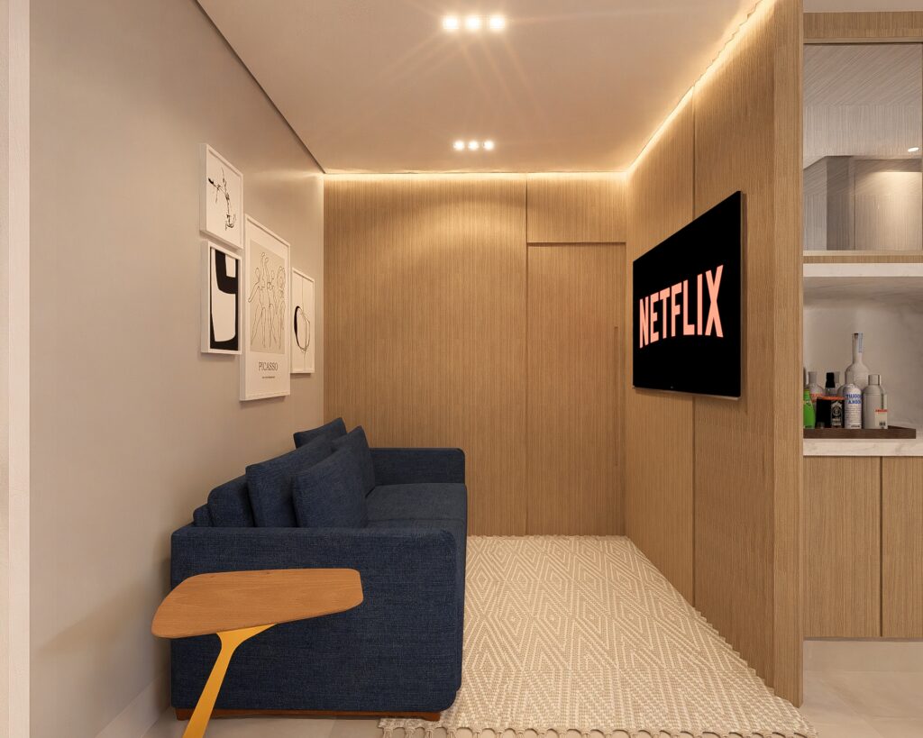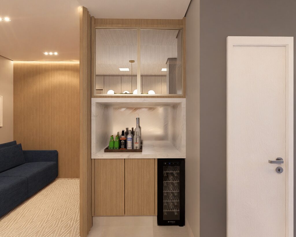 Para completar a área social, incluímos um mini bar, pensado especialmente para o casal. Ele agrega elegância e praticidade, tornando a experiência de receber ainda mais agradável. Inclusive, o mini bar funciona como elemento de destaque no projeto, equilibrando estética e funcionalidade.
