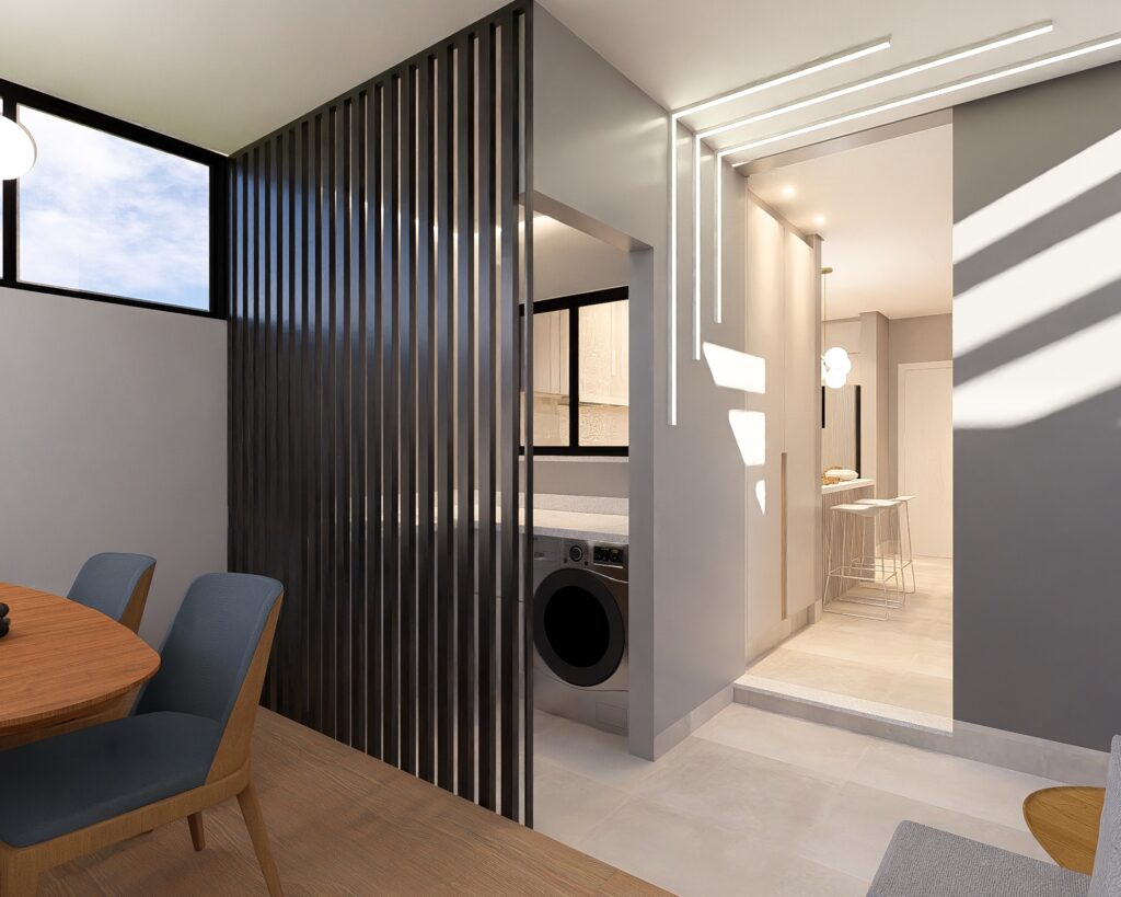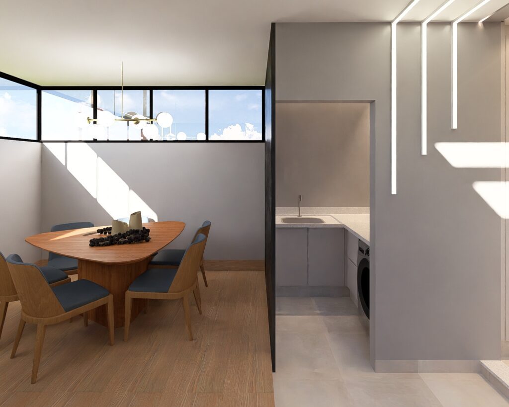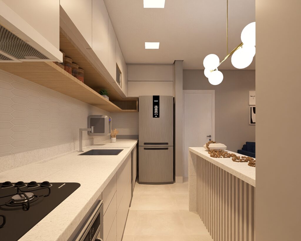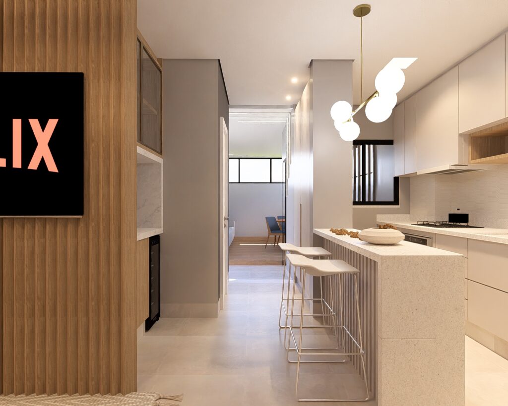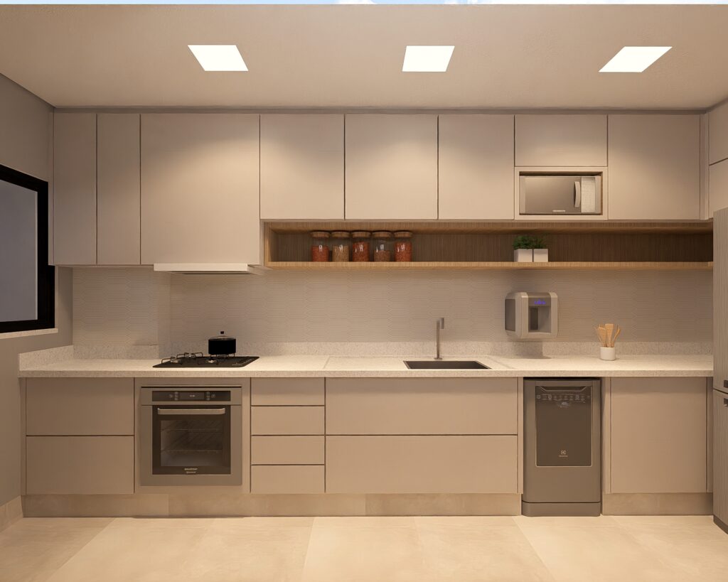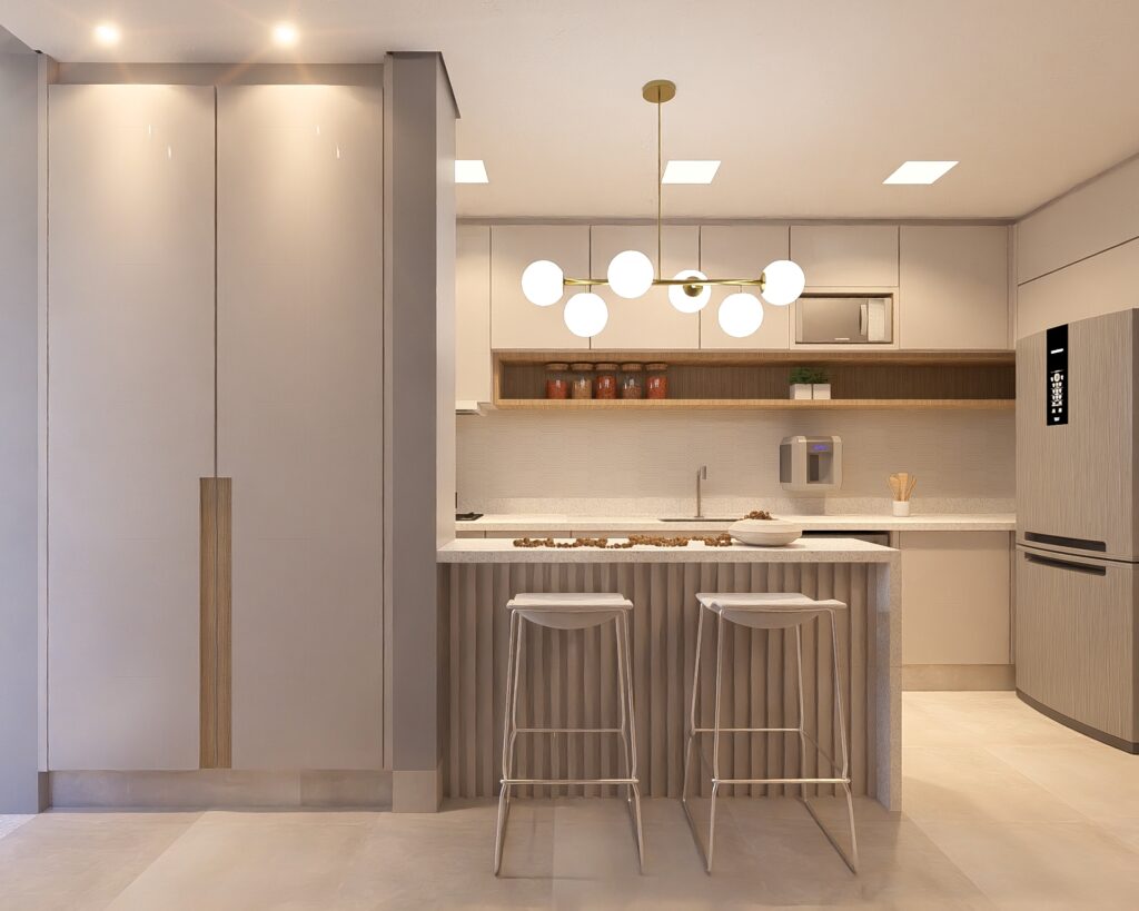 Desde o início, a principal proposta foi criar ambientes integrados. Dessa forma, a sala de estar e a cozinha foram unidas para proporcionar amplitude e fluidez no dia a dia. Essa integração não apenas melhora a circulação, mas também cria uma atmosfera mais convidativa, ideal para famílias que gostam de receber.